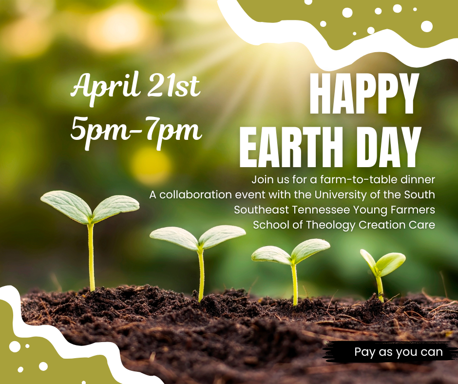 Join us for a community meal, farm-to-table creation by our excellent culinary team. In collaboration with Deborah McGrath, Professor of Biology and Assistant Dean of the Environment at the University of the South, Southeast Tennessee Young Farmers, and the School of Theology & Creation Care Committee, we are teaming up to offer an evening of food, fellowship, and celebration of our bountiful earth.